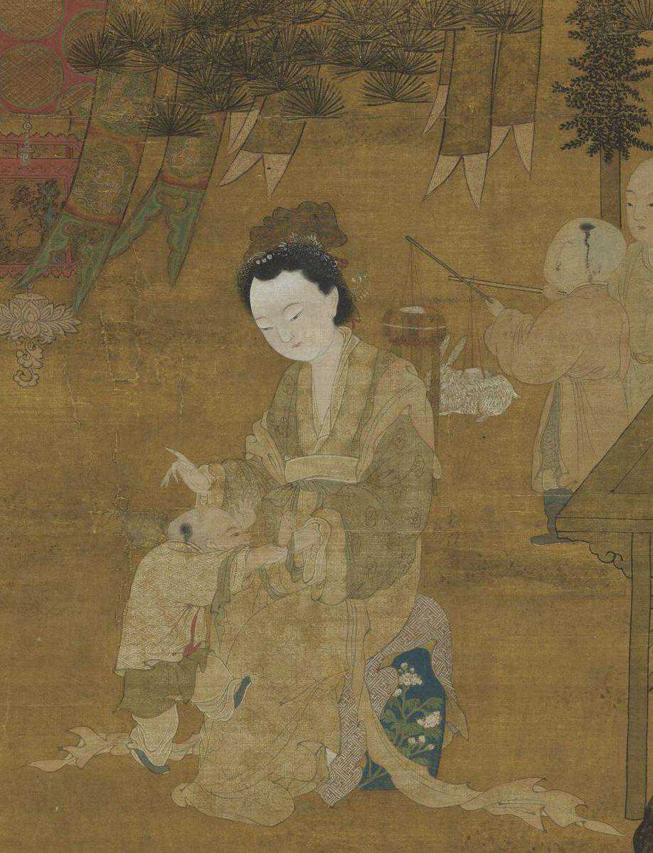 此圖沒有落作者的名款,從技法上分析,圖中人物的畫像應(yīng)是由擅長寫實畫的郎世寧繪制。他在西洋肖像畫的基礎(chǔ)上,巧妙地吸取了傳統(tǒng)中國“寫真”畫技法,生動地表現(xiàn)出不同人物的體態(tài)和神情。圖中的屋宇、樹石背景是由中國畫家補繪,畫家們以傳統(tǒng)的中國山水畫、界畫技法,精心勾描、點染,不僅渲染出元宵節(jié)喜慶祥和的熱烈氣氛,同時展示出乾隆皇帝與家人間濃濃的親情。