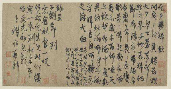 楊維楨行書作品《元夕與婦飲詩》全篇真、行、草相雜,行草中多帶入章草筆法和結(jié)體。下筆力透紙背,老辣之甚。字形大小懸殊,章法跌宕起伏,似亂石鋪街,全篇有一種跳蕩、激越的節(jié)奏,氣勢豪放雄宕,狂怪清勁。