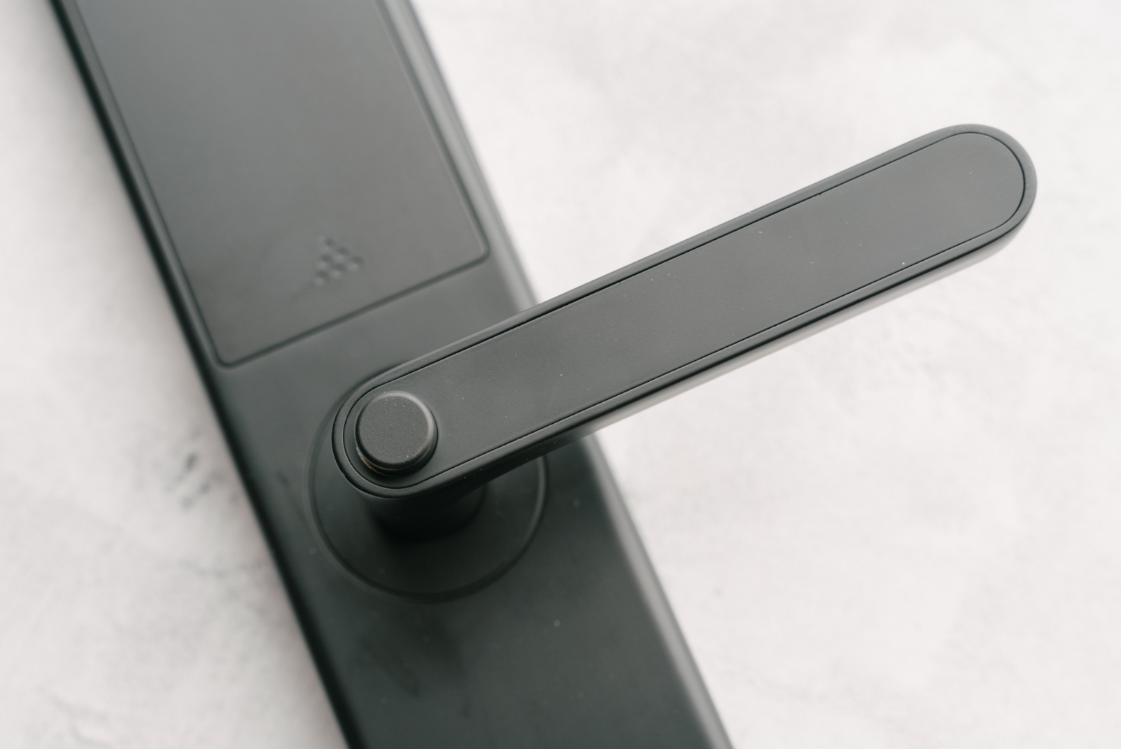 下層則為智能鎖本體了,OJJ本身就為設計師品牌,顏值相當可以,純黑色的面板設計,通體啞光噴漆設計。它的主體材料為鋁合金材質,堅固耐用,并且據官方的說法,它可以經受住96小時鹽霧實驗,即使在沿海地區,外觀也絕不氧化,實驗室中的數據它可以抵御-25℃到55℃極寒極高溫考驗。而門把手采用了耐用的德國雙軸承結構,十年手把不會下垂,在品質上值得信賴。