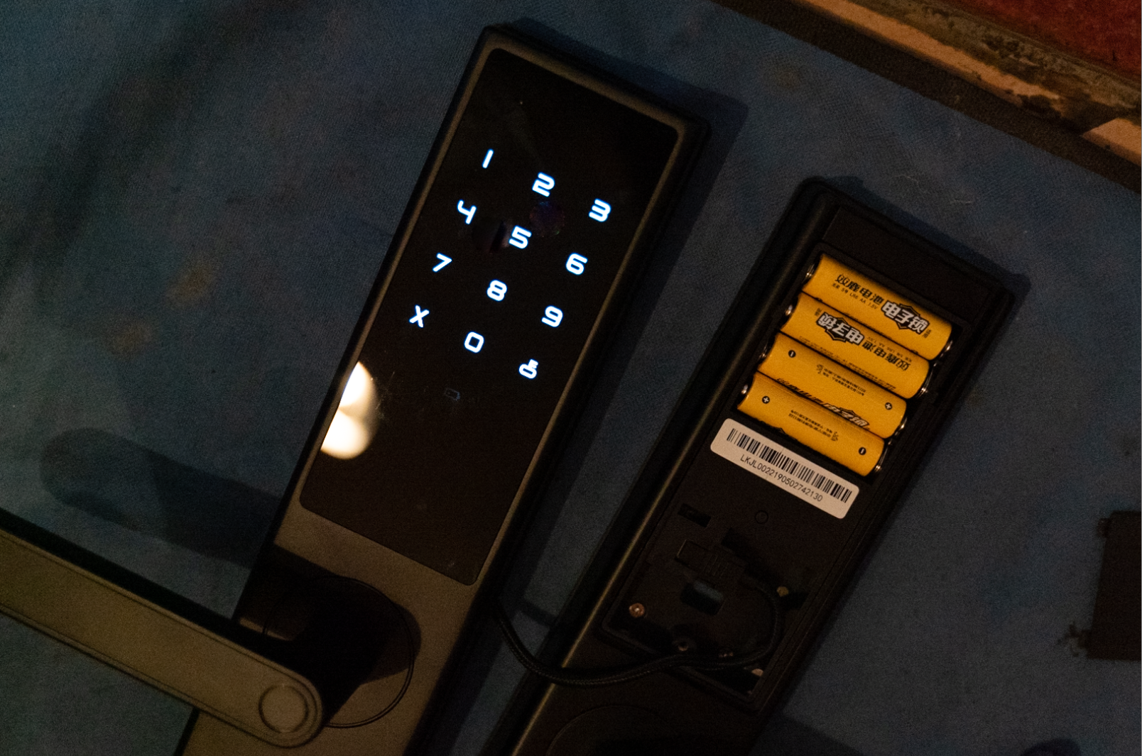 師傅首先熟練的將舊門鎖拆掉。然后提前安裝電池到OJJX1上,接好內外面板連線進行產品可用性測試。