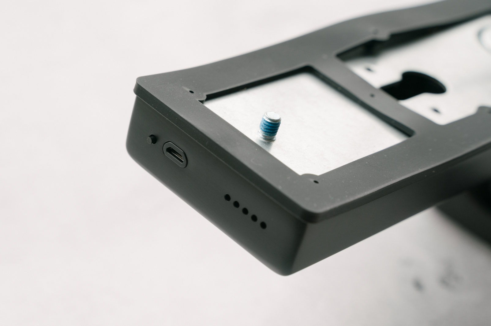 上圖為外面板底部,從右到左分別是有喇叭孔、MicroUSB應急電源接口和應急重啟按鈕。